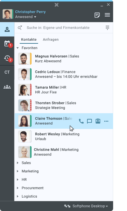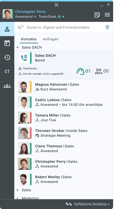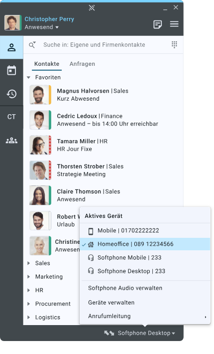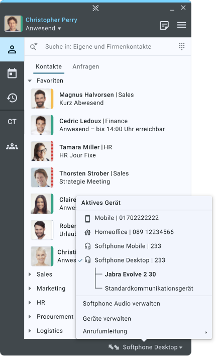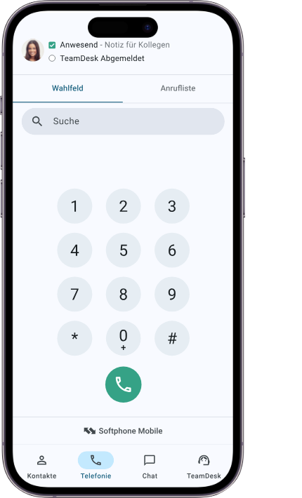 Sie können via Softphone telefonieren und haben Zugriff auf die Präsenzinformationen Ihrer Kollegen. Ihren eigenen Status können Sie ebenfalls jederzeit mobil anpassen oder eine Rufumleitung einrichten.
