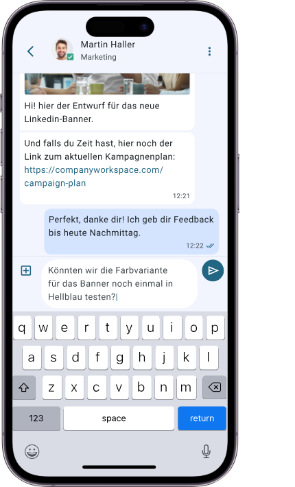 Sie sind gerade auf dem Sprung? Mit der Mobile App können Sie den Chat, den Sie im Büro begonnen haben, unterwegs nahtlos fortführen. Dabei geht nie eine Information verloren. Ihre Nachrichten werden immer sicher im Journal gespeichert.